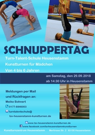 Die Turn-Talent-Schule Heusenstamm sucht junge Turnerinnen im Alter von 4-6 Jahren. Deshalb lädt sie zum Schnuppertraining am 29. September 2018 alle…