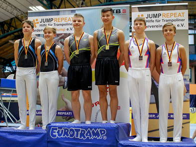 Mit einer wahnsinnig hohen Schwierigkeit gingen Miguel Feyh und Valentin Risch (DTV Die Kängurus/SG Frankfurt-Nied) ins Rennen bei den 13/14jährigen Jungen. Sie konnten beiden Übungen vollständig präsentieren und im Finale noch mehr Schwierigkeit drauf legen. Verdient und mit fünf Punkten Vorsprung sicherten sie sich den Sieg. Eine Pflicht-Kür reichte Jan Dannenberg mit seinem Partner Michael Gladjuk (SG Frankfurt-Nied/TV Nellingen) zum Gewinn der Bronze-Medaille. Paul Dousa und Paolo Feyh (DTV Die Kängurus) wurden Fünfte.
