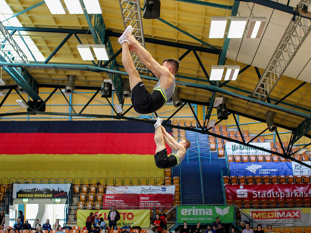 Der zweite Tag der Deutschen Meisterschaften in Dessau galt dem Synchronturnen. Erstmal musste man sich nicht für diese Meisterschaft qualifizieren, hier wurde lediglich ein Mindest-Schwierigkeitswert im Vorkampf verlangt. So gab es verschiedene Strategien in den Übungen zu sehen.