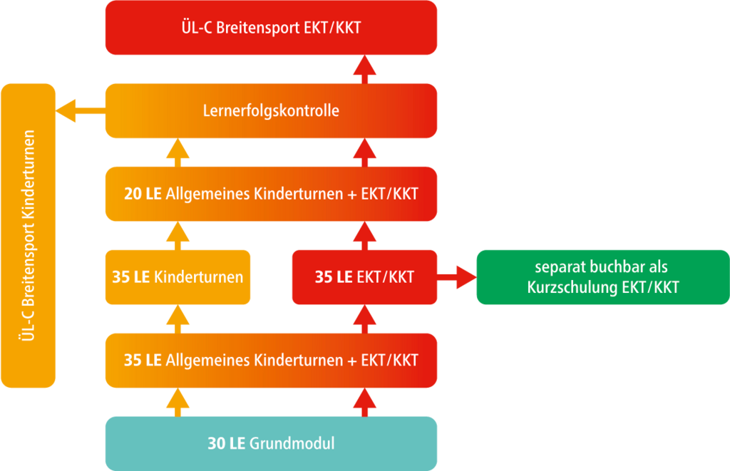 Diese beiden Abschnitte in Büttelborn sind auch als sogenannte "Kurzschulung Eltern-Kind-Turnen/Kleinkinderturnen" separat buchbar und können somit ohne vorher absolviertes Grundmodul besucht werden! Damit wird Interessierten die Möglichkeit geboten, sich zu qualifizieren ohne eine komplette Ausbildung absolvieren zu müssen. Für diese Teilnehmer, die natürlich keine Übungsleiterlizenz, aber eine Teilnahmebescheinigung erhalten, ist ihr Lehrgang nach diesen beiden Wochenenden beendet. Diejenigen, die das komplette Fachmodul absolvieren, um eine Lizenz zu erwerben, treffen sich an zwei weiteren Lehrgangsabschnitten erneut mit dem Fachmodul Kinderturnen, um die Modellstunden sowie die Lernerfolgskontrolle durchzuführen.