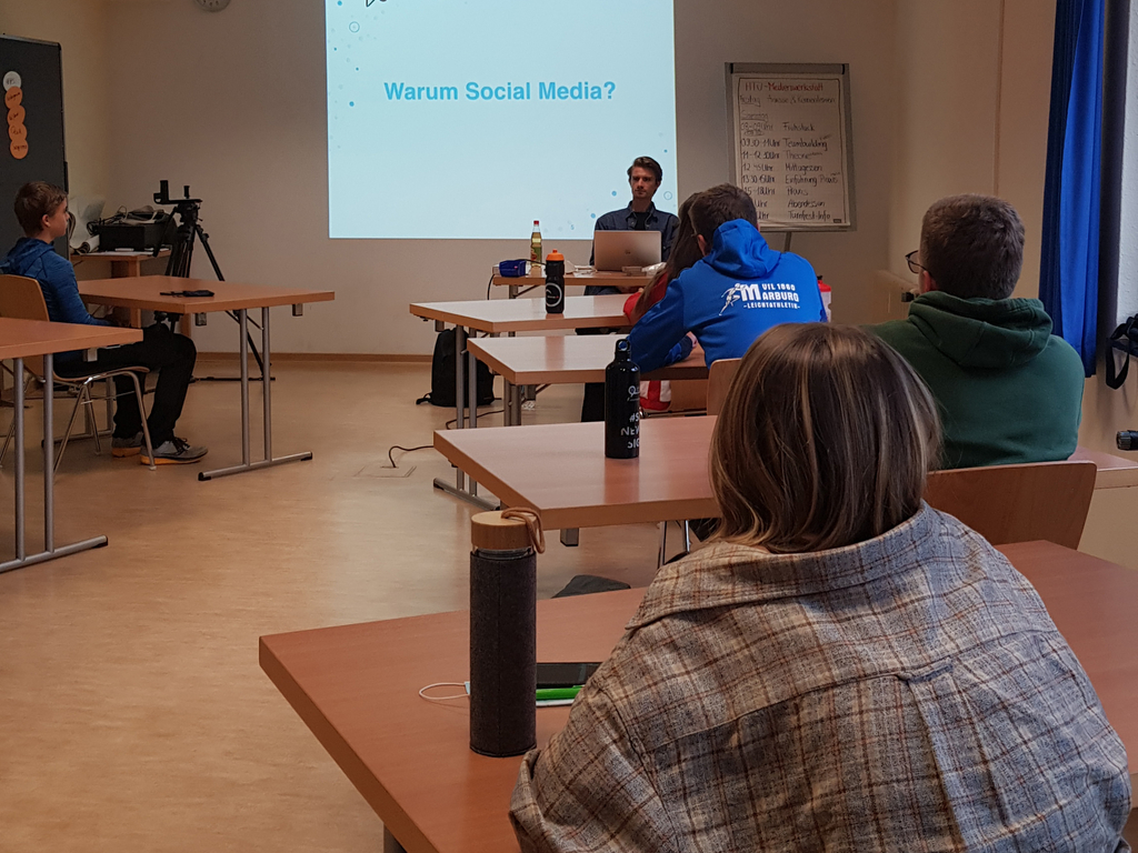 Auch der nächste Morgen stand ganz unter dem Motto Gruppenfindung und Team-Building. Dazu führte HTJ-Inklusionscoach Eileen Jakobi die Teilnehmenden in die benachbarte Sporthalle und ermöglichte mit Hilfe von sorgfältig ausgewählten gruppendynamischen Spielideen das weitere Zusammenwachsen der Gruppe. Den Mittag und Nachmittag gestaltete das Team der HTJ zusammen mit dem eingeladenen Referenten Marius Kollbacher, Social-Media-Redakteur des Hessischen Rundfunks. In einem Social-Media-Crashkurs erläuterte Marius unter anderem, wie Instagram für die Berichterstattung von Veranstaltungen genutzt werden kann. Darüber hinaus gab er Tipps für die Erzählung einer Geschichte auf Social Media und stellte verschiedenes Equipment und einige Apps vor, um die Aufnahmen mit dem Smartphone noch besser werden zu lassen.