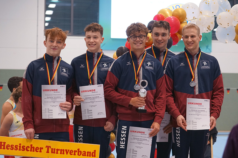 Im Wettkampf der Altersklasse 16-29 Jahre kamen Julius Wiegend (bester am Pauschenpferd) und Marius Roth an allen sechs Geräten zum Einsatz. Mit Rang eins und zwei in der Einzelwertung zeigten sich beide als sehr stabil. Verletzungsbedingt nicht an allen Geräten turnend, war der in der Bundesligamannschaft des TV Weißkirchen turnende Julian Peters am Barren mit 13,05 Punkten bester Turner und heimste auch mit Schraubensalto-Bewegungen und 13,90 Punkten die drittbeste Benotung des Bodenturnens ein. Mit guten Leistungen ergänzten Janis Vogt (TG Unterliederbach) und Julius Rinn (TV Großen-Linden) die Gesamtwertung des hessischen Teams. Dass die Hessen am Ende den Turnern des Sächsischen Turn-Verbandes den Vortritt lassen musste, lag in erster Linie am Turnen an den Ringen. Hier waren die Sachsenturner um 3,45 Punkte besser als das Hessen-Team und siegten letztlich mit 2,45 Punkten Vorsprung. Mit Rang zwei gelang der HTV-Mannschaft aber eine gute Steigerung zum Vorjahr, als man mit Rang vier knapp am Podest vorbeiturnte. Dritter wurde die Mannschaft des Badischen Turner-Bundes.