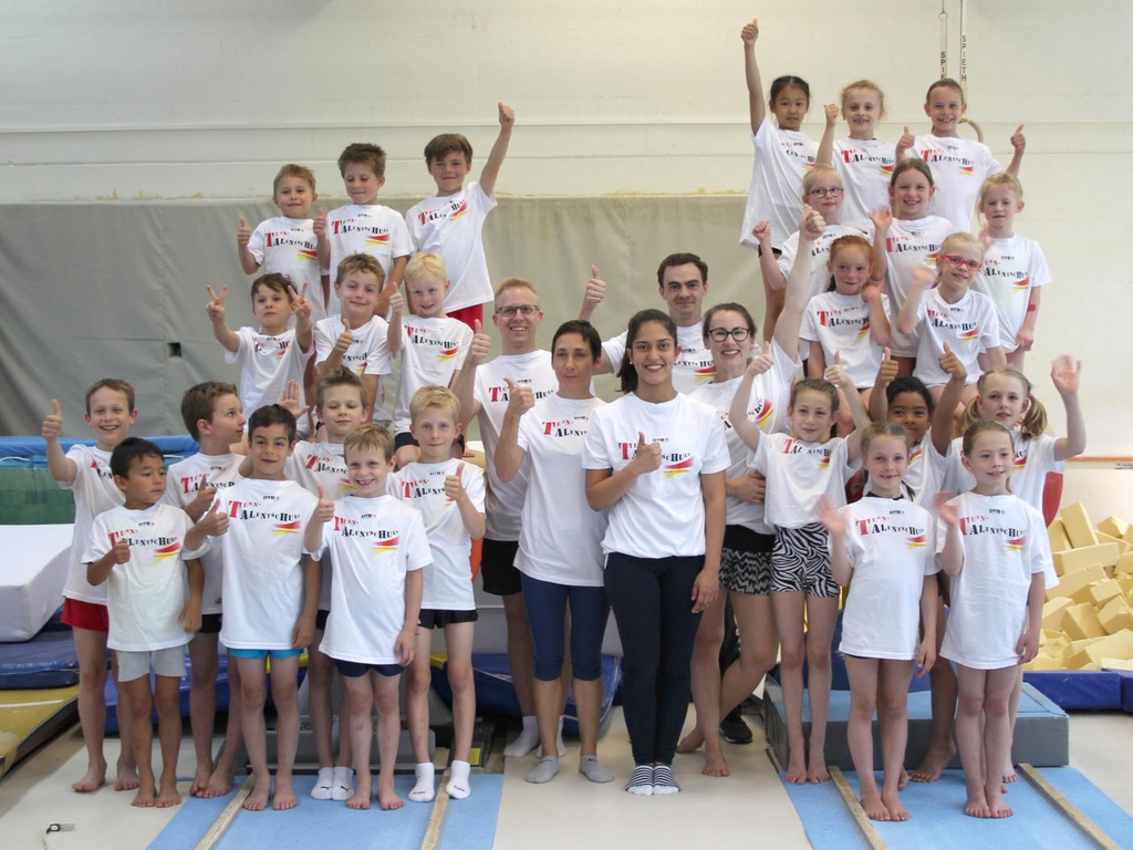 Strahlende Gesichter gab es dann natürlich auch auf dem gemeinsamen Gruppenfoto. Die Turntalentschule Frankfurt bietet ein sportliches Zuhause für mehr als 30 Turnerinnen und Turner. Außer den T-Shirts gab's ein Prädikat für die beiden Cheftrainer Charlotte Birkmeyer und Dominik Klenner.