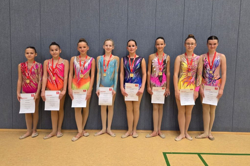 Landesmannschaftssieger in der K7 wurde die SG Sandbach mit Marie Glenz, Helena Lohmüller, Lorena Santis Goncalves und Sofia Teichrib mit den Geräten Reifen und Keulen.